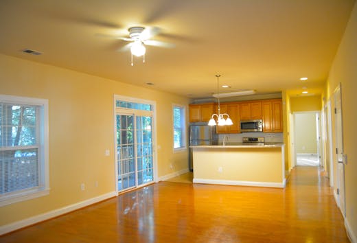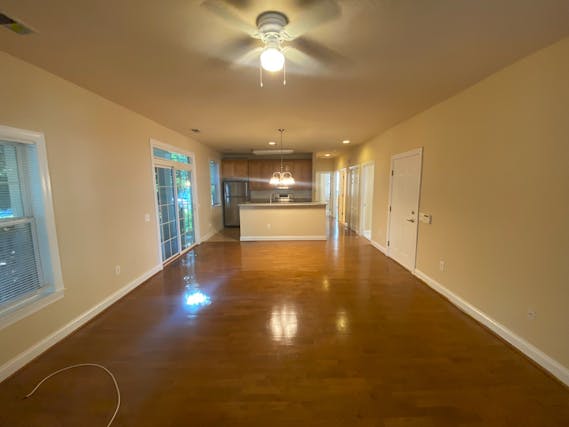 The spacious, open-concept floor plan includes a welcoming entry, a living room with three windows and freshly painted walls, and a dining room with a sliding door leading to a covered side porch surrounded by trees for privacy.