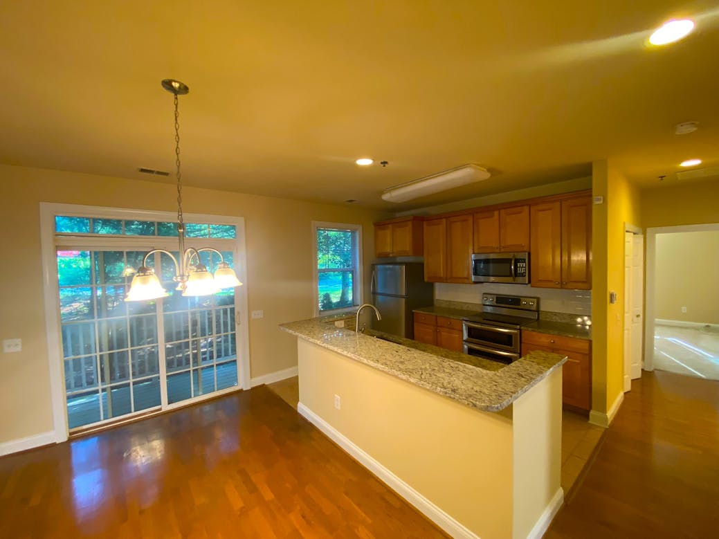 The kitchen features 42” cabinets, matching appliances, recessed lights, and a spacious pantry.